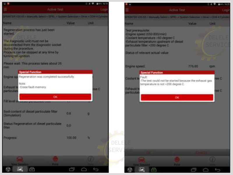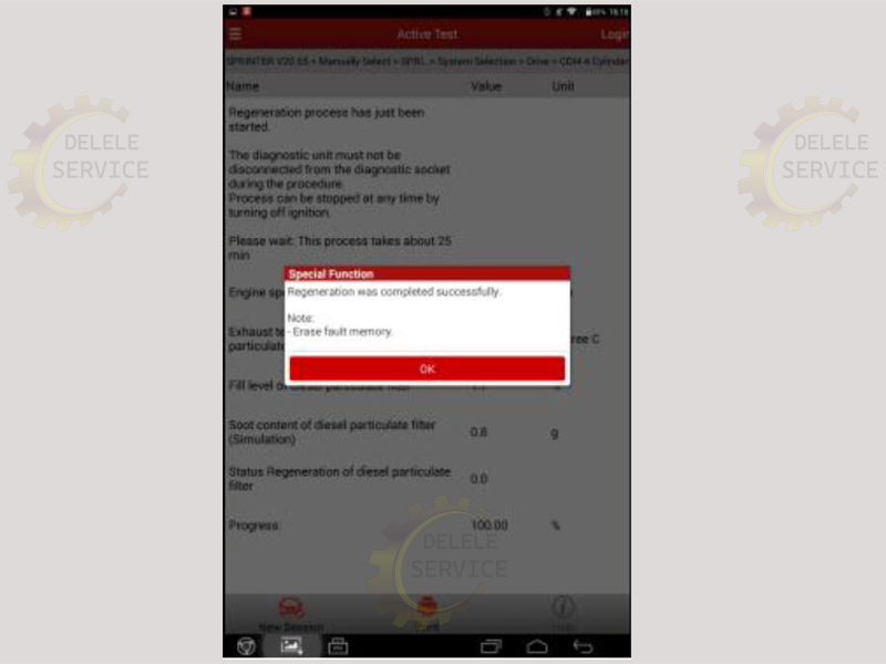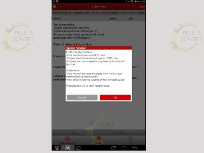 Stop the vehicle when prompted and allow the engine to idle, then click OK to start DPF regeneration.